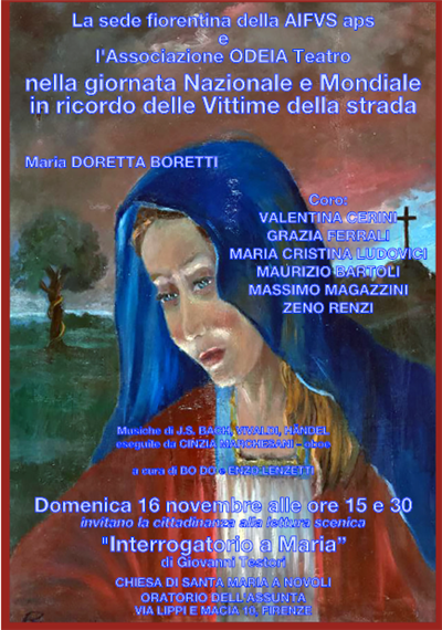 Maria Doretta Boretti, giornalista, madre di Elisabetta e Maria Chiara Casini, decedute in seguito a uno dei più gravi incidenti avvenuti a Firenze, il 14 novembre 2004, nel viale che circonda lo stadio Artemio Franchi, sarà protagonista della lettura scenica "Interrogatorio a Maria", domenica 16 novembre 2025, alle 15,30, nella chiesa di "Santa Maria a Novoli", oratorio dell'Assunta, in via Lippi e Macìa 10, a Firenze.