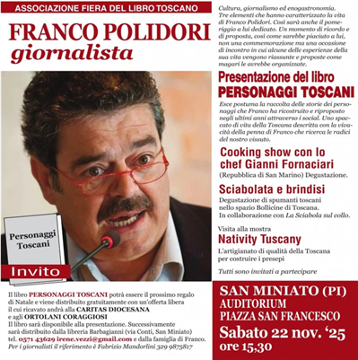 Un pomeriggio per ritrovarsi, condividere ricordi e dare continuità al lavoro di un collega che ha raccontato la Toscana con passione, curiosità e finezza di sguardo. A pochi mesi dalla sua scomparsa, avvenuta nell’agosto 2025, Franco Polidori – giornalista, presidente di Arga Toscana e anima di tante iniziative culturali ed enogastronomiche – sarà al centro dell’incontro organizzato per sabato 22 novembre 2025, alle ore 15.30, all’Auditorium di Piazza San Francesco a San Miniato.